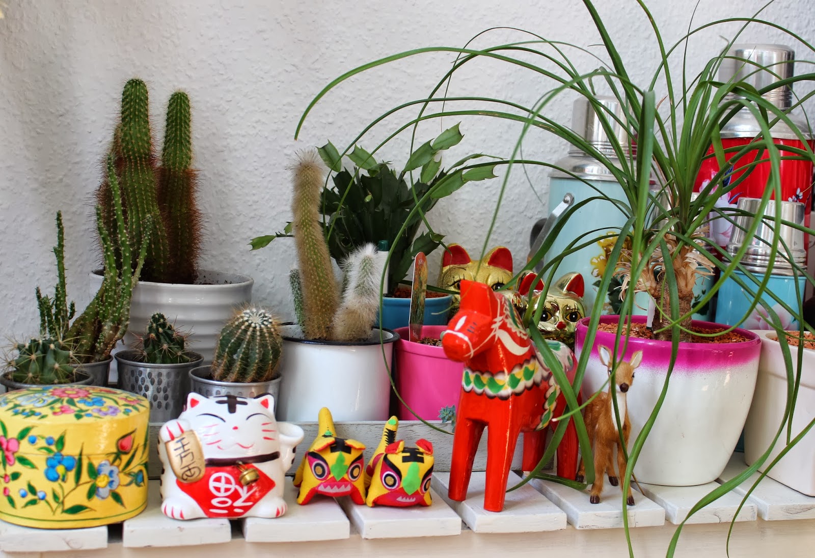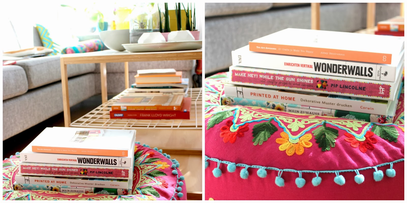 Viele Dinge sind aus den unterschiedlichsten Läden: Der pinke Pouf und die Nackenrolle sind von Strauss Innovation, die hölzernen Hunde von Muji, die Lampe von Hema, die gelbe Laterne von Butlers und die Kerzenständer und petrolfarbenen Vasen von Tiger.