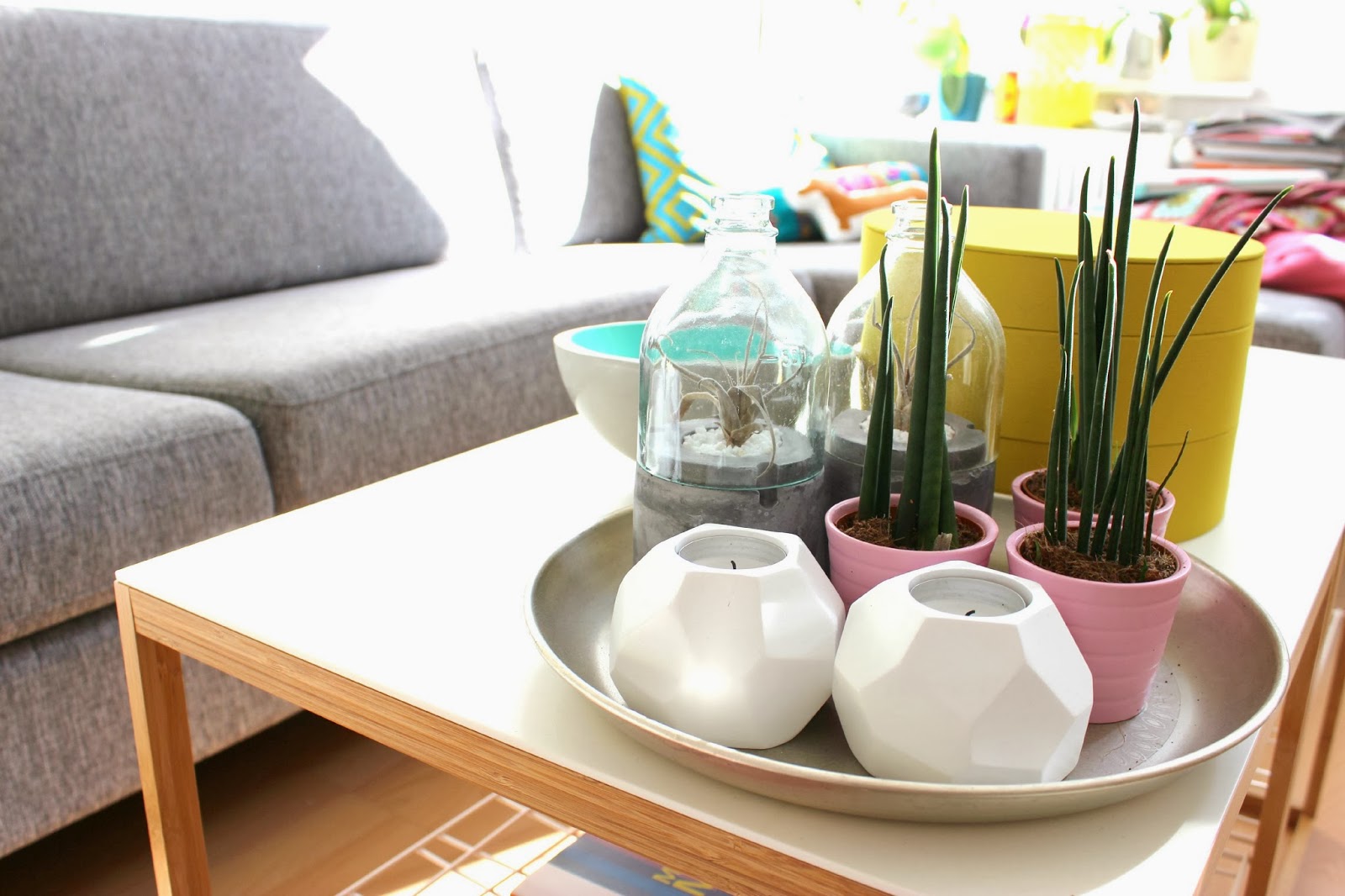 Das Sofa und die geometrischen Teelichthalter haben den Weg von Bolia zu uns nach Hause gefunden. Auch ein paar Handmade Kleinigkeiten sind dabei unter anderem die Betonschale von Glänzend Grau und der Kerzenständer neben der Lampe von Frau Sieben. Das „A“-Poster aus ist aus Wien, die asiatischen Katzen-Hunde, die Katzenspardose und das Hundekissen sind Reisemitbringsel aus New York.