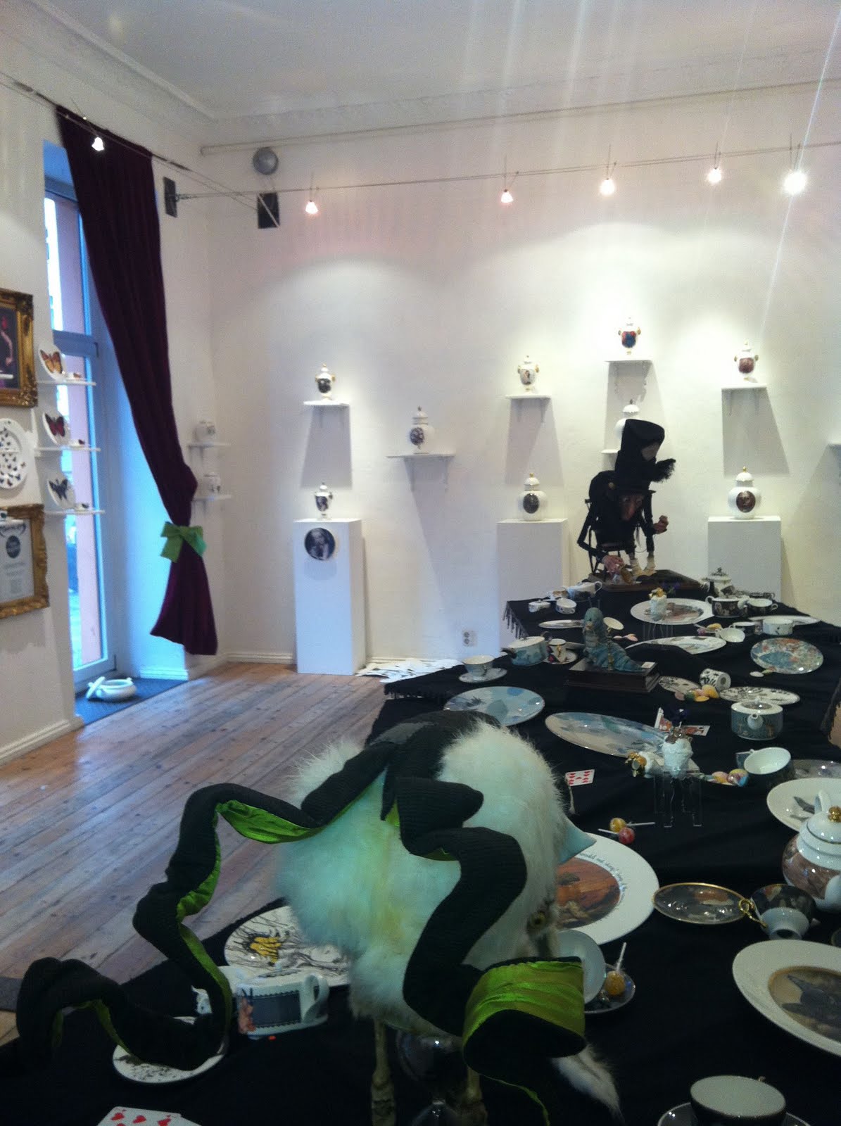 Trotz Wind und Wetter hat sich Sterntaler heute in die Strychnin Gallery gewagt, um sich die Ausstellung „The Mad Potters Tea Party“ nicht entgehen zu lassen. Über 100 internationale Töpferer haben sich von Alice im Wunderland inspirieren lassen und phantastisch morbides Porzellan kreiert. Sterntaler und Belgeitung fanden es sehr sehenswert und waren begeistert von der Deko aus Brauspulver-Bonbons und Spielkarten und natürlich von Tellern, Tassen und Co.